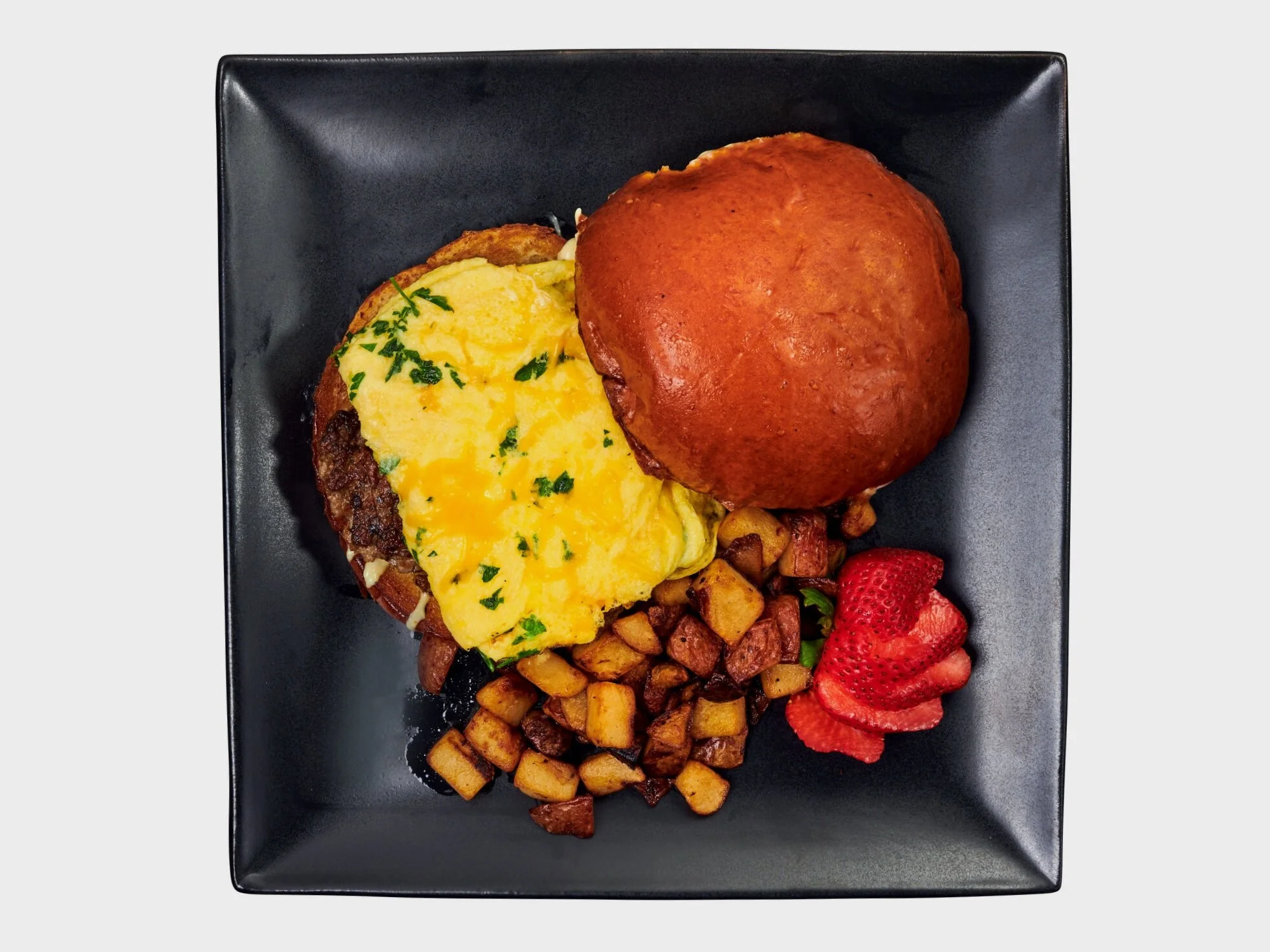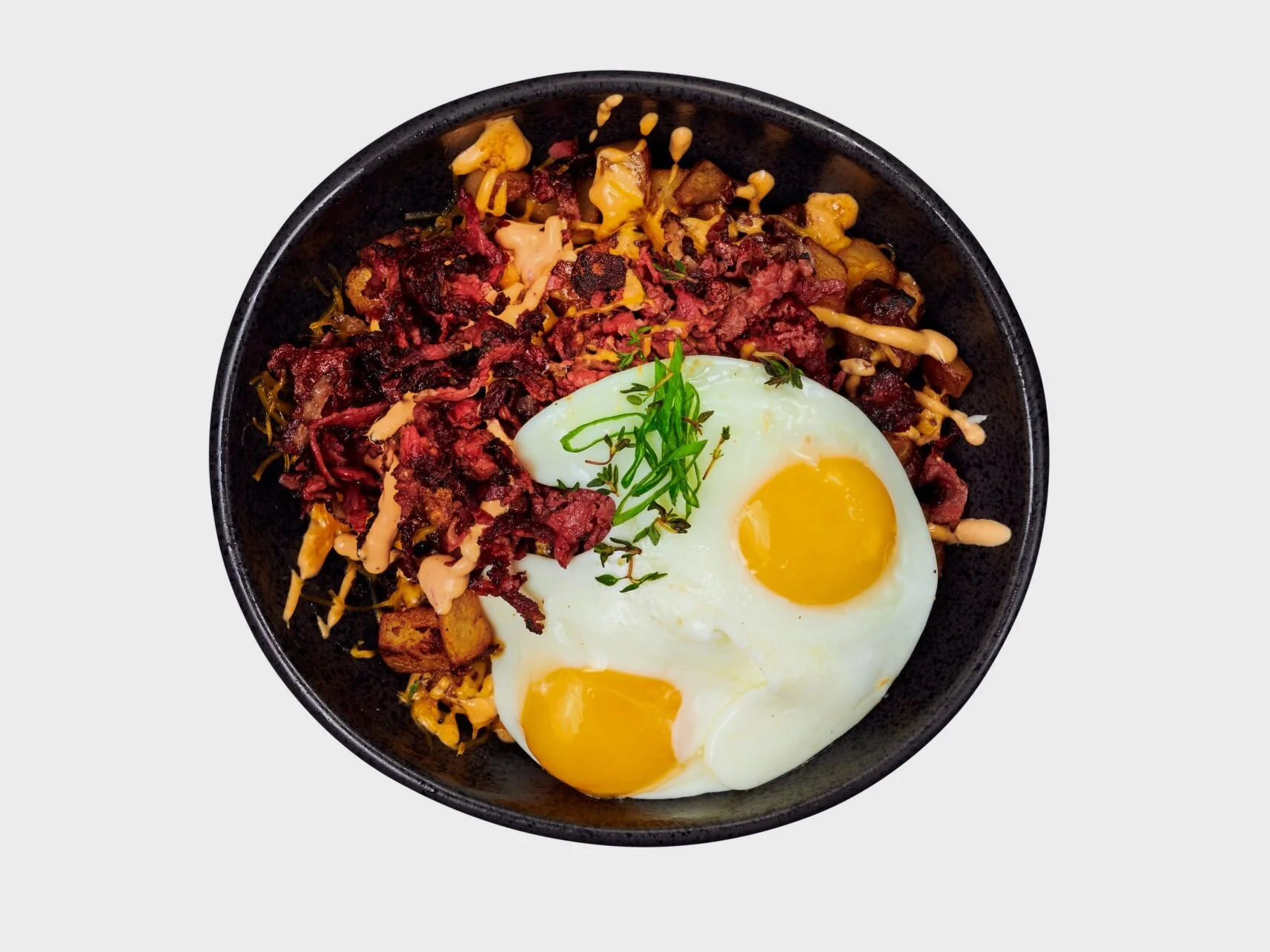 Home-fried potatoes, grilled pastrami & shredded cheddar, topped with two fried eggs & chipotle aioli, garnished with fresh thyme & green onion