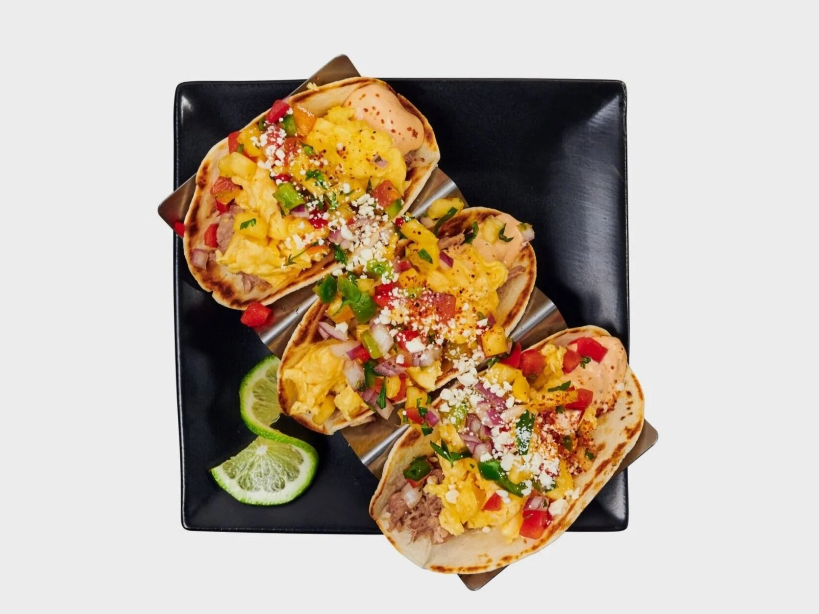 Slow-roasted pulled pork, scrambled eggs, house pineapple salsa, chipotle aioli, Cotija cheese, topped with Tajin seasoning