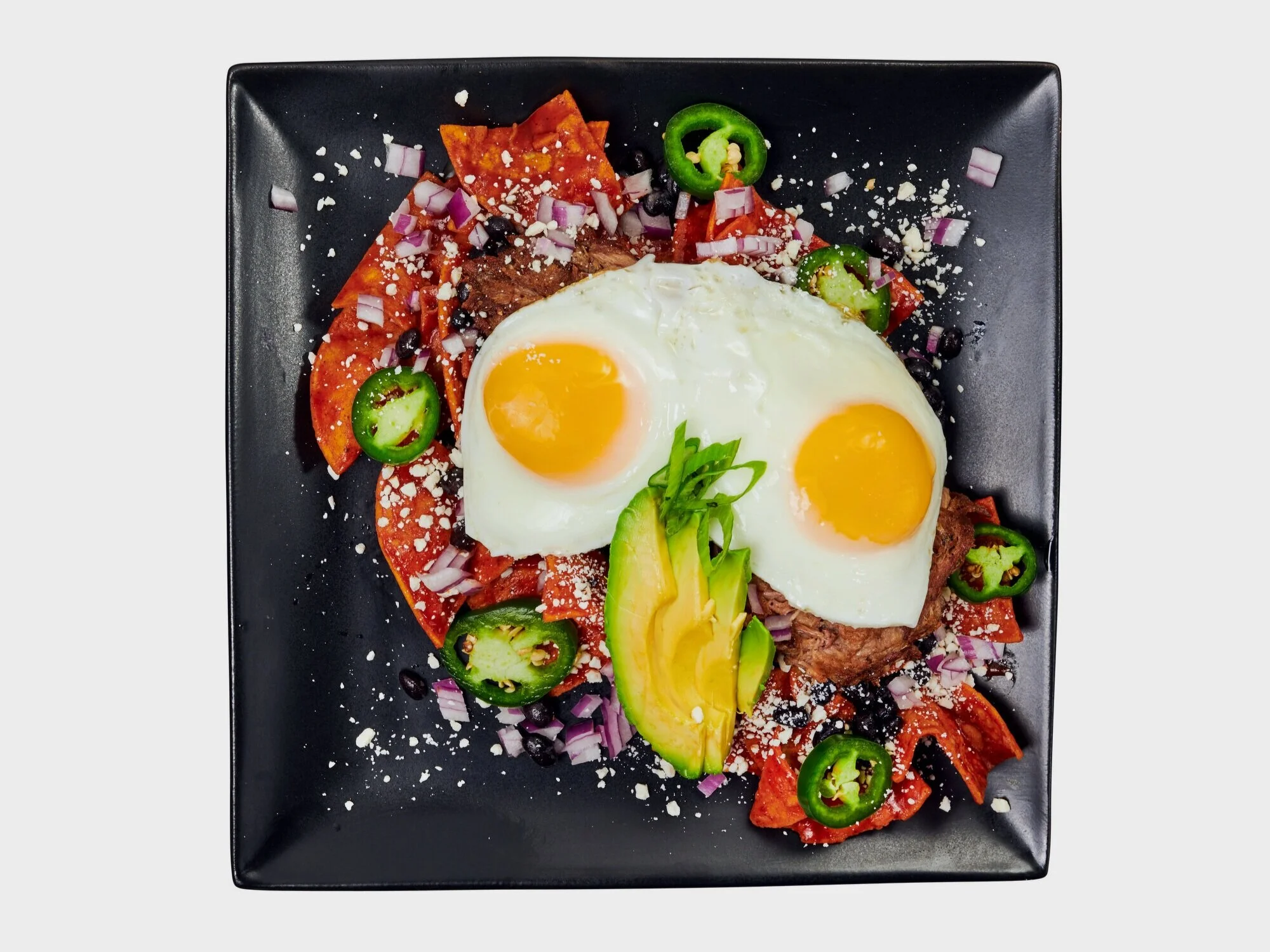Fresh tortilla chips topped with slow-roasted pulled pork, two fried eggs, red enchilada sauce, avocado, black beans, red onion, Cotija cheese& garnished with jalapeno & green onion