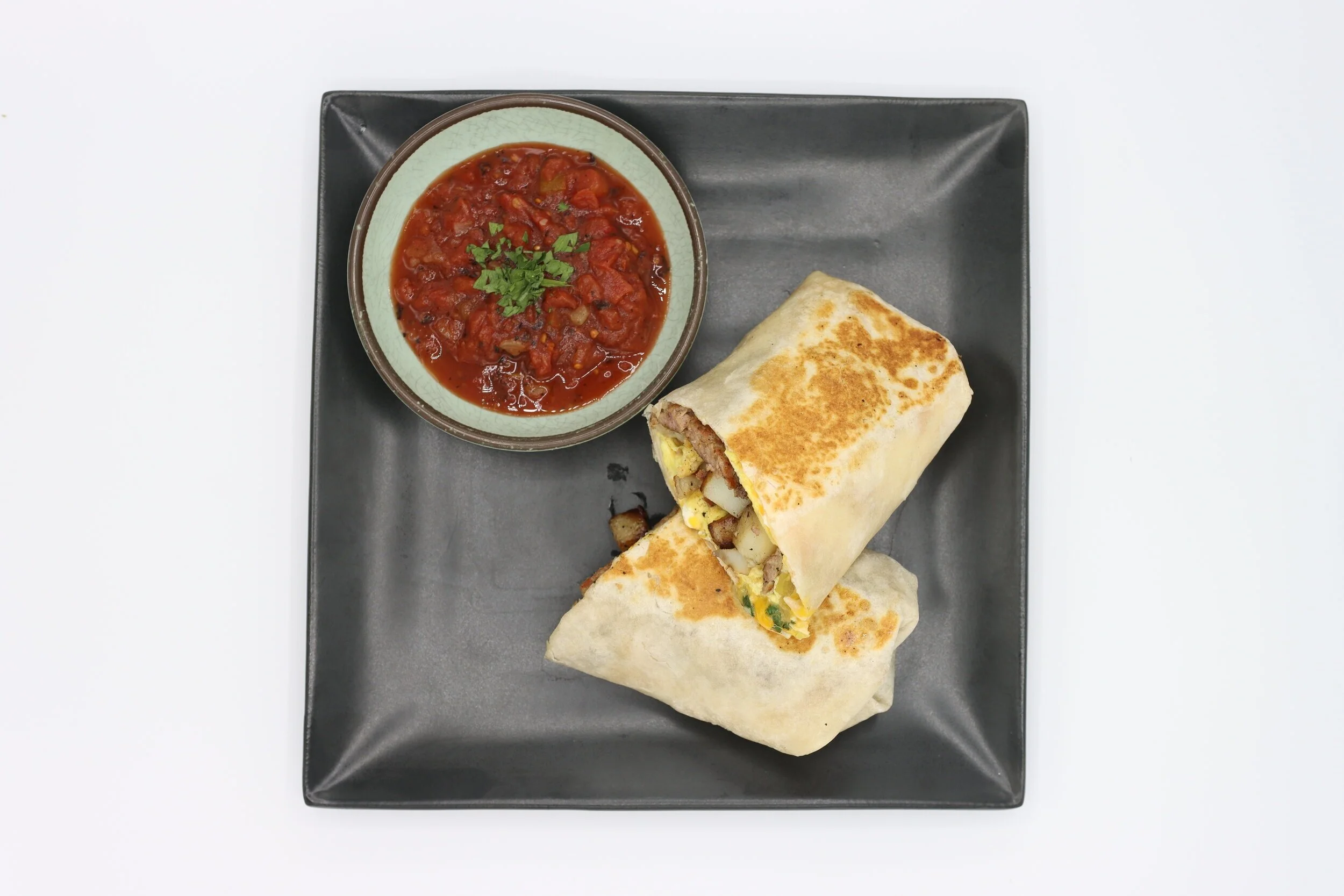 Eggs, choice of meat, breakfast potatoes, cheese, green chilies, cilantro & sour cream on a flour tortilla with a side of salsa