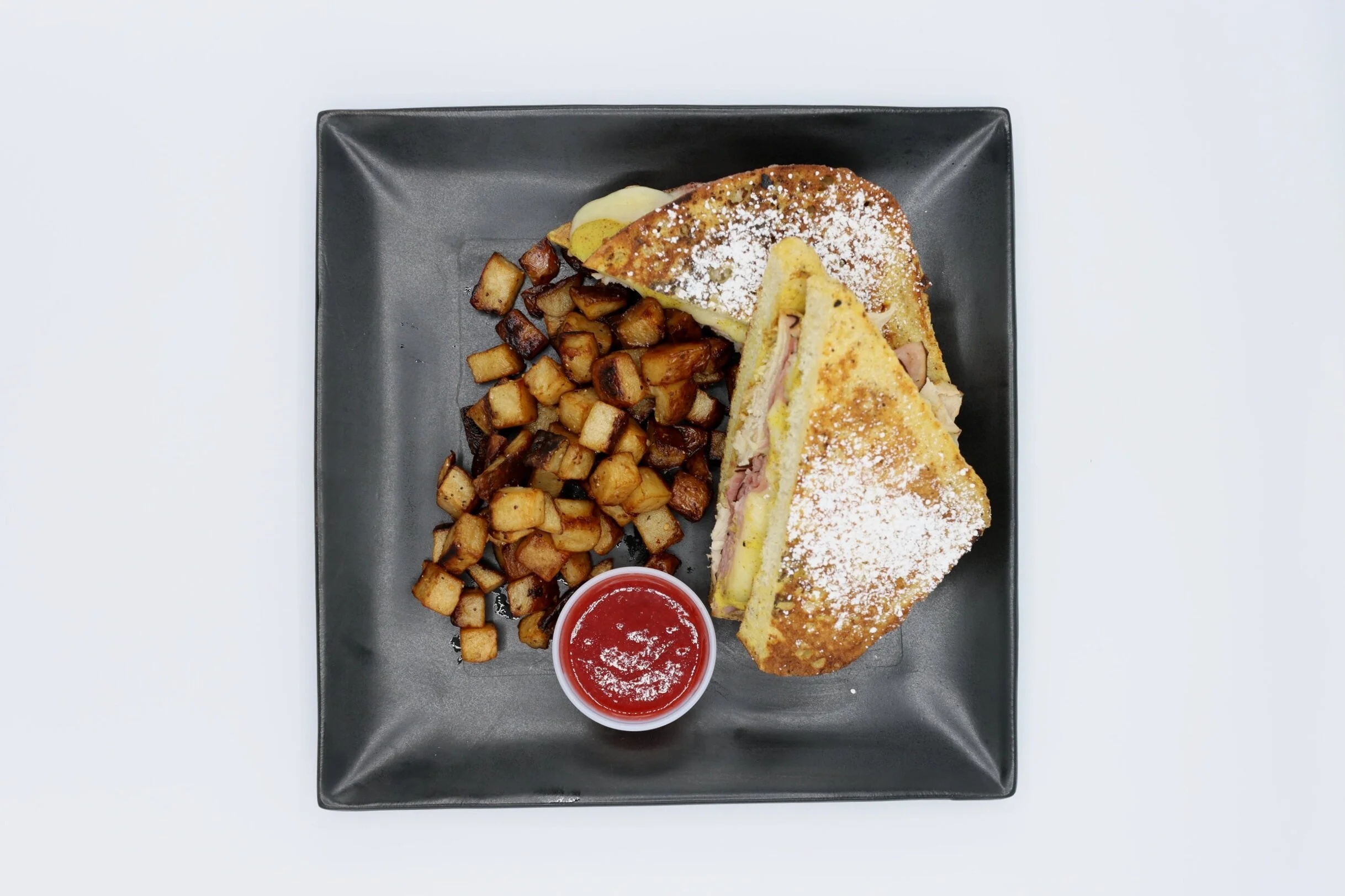 Egg dipped sourdough, turkey, ham, swiss cheese, pale ale mustard, served with strawberry compote, maple syrup