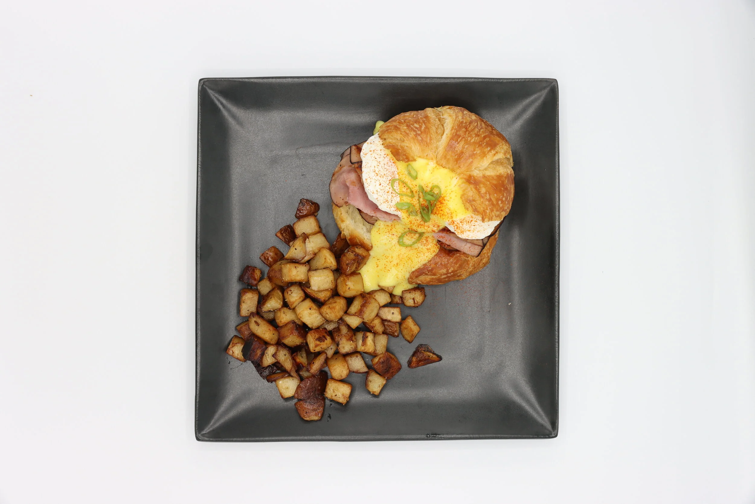 Toasted From the Hearth sourdough & pan-fried ham topped with fresh spinach, tomato, poached eggs & pesto hollandaise, garnished with paprika & green onion